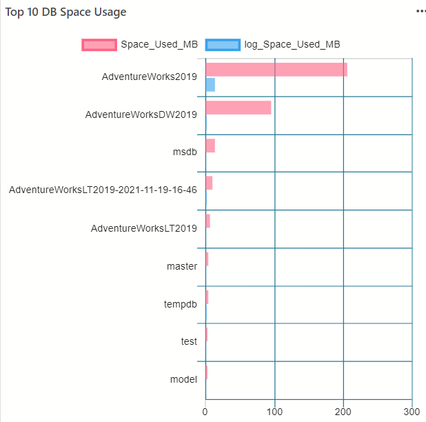 Azure Data Studio reportsThe report shows the space used. Not only does it show the data file space used, but also, the log space used per database. The report shows the top 10 databases that take more space.