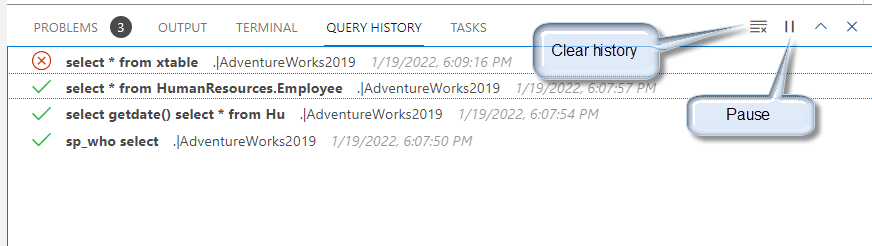 Optionally, at the right of the pane, you also have the Clear All history option to clear all the query history and Pause to pause momentarily the query history.