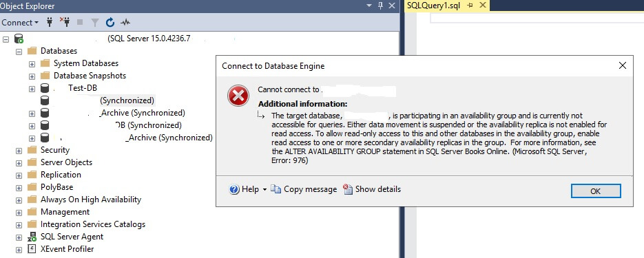 There are a few objects, like logins, permissions, jobs etc., that are to be configured on each individual node in the cluster. In the cluster, while the primary node is in use, the secondary nodes are not accessible (read access can be enabled but no write access is granted). If you try to access a database, you will get an error like the one below.