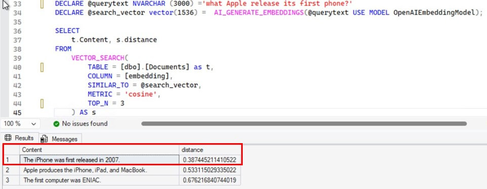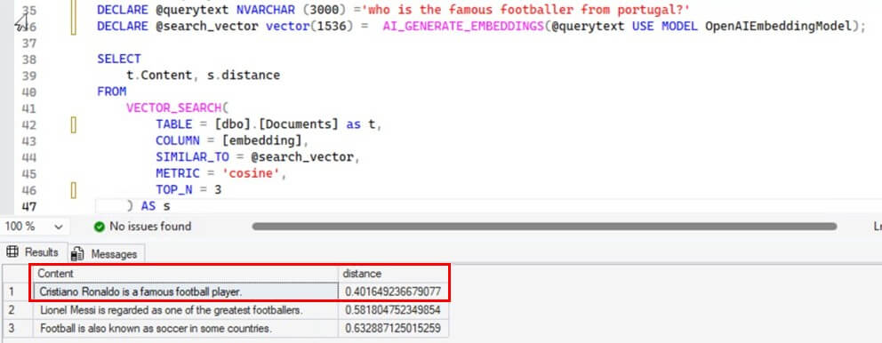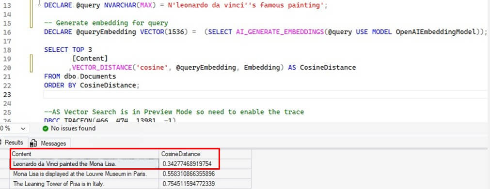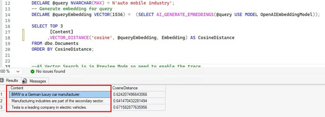 Here is an explanation on how the code worked. In both the examples above, first we take a input text - 'auto mobile industry' and 'leonardo da vinci's famous painting'. Then we generated a vector embedding of this input text using the same external AI model and stored it in a queryEmbedding variable. Finally using VECTOR_DISTANCE function we calculated the cosine similarity between the input text vector and values from Embedding column of the documents table. It compared the distance between the input vector and each row of embedding column one by one and returns the corresponding top 3 most similar row from Content column. Please note that the less the value of cosine distance, the more is the similarity.