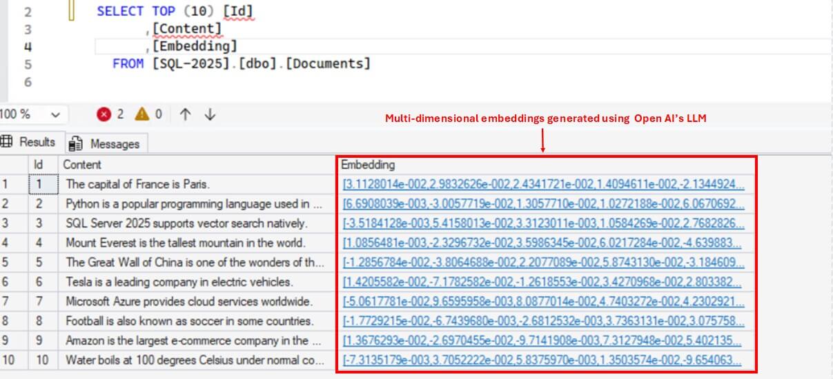 INSERT INTO dbo.Documents (Content) VALUES (N'The capital of France is Paris.'), (N'Python is a popular programming language used in AI and data science.'), (N'SQL Server 2025 supports vector search natively.'), (N'Mount Everest is the tallest mountain in the world.'), (N'The Great Wall of China is one of the wonders of the world.'), (N'Tesla is a leading company in electric vehicles.'), (N'Microsoft Azure provides cloud services worldwide.'), (N'Football is also known as soccer in some countries.'), (N'Amazon is the largest e-commerce company in the world.'), (N'Water boils at 100 degrees Celsius under normal conditions.'), (N'ChatGPT is an AI model developed by OpenAI.'), (N'India is the largest democracy in the world.'), (N'Bananas are rich in potassium.'), (N'Shakespeare wrote the play Romeo and Juliet.'), (N'The human brain contains billions of neurons.'), (N'Coffee is one of the most popular beverages in the world.'), (N'Cristiano Ronaldo is a famous football player.'), (N'Google was founded by Larry Page and Sergey Brin.'), (N'Bitcoin is a type of cryptocurrency.'), (N'The Pacific Ocean is the largest ocean on Earth.'), (N'Leonardo da Vinci painted the Mona Lisa.'), (N'The speed of light is approximately 299,792 km per second.'), (N'Tokyo is the capital city of Japan.'), (N'The Sahara Desert is the largest hot desert in the world.'), (N'COVID-19 pandemic started in 2019.'), (N'Einstein developed the theory of relativity.'), (N'Lionel Messi is regarded as one of the greatest footballers.'), (N'J.K. Rowling wrote the Harry Potter series.'), (N'Water is composed of hydrogen and oxygen atoms.'), (N'YouTube is a video sharing platform owned by Google.'), (N'Apple produces the iPhone, iPad, and MacBook.'), (N'The Amazon Rainforest is known as the lungs of the Earth.'), (N'Facebook was founded by Mark Zuckerberg.'), (N'The currency of the United States is the US Dollar.'), (N'Mona Lisa is displayed at the Louvre Museum in Paris.'), (N'The Statue of Liberty is located in New York.'), (N'Elon Musk founded SpaceX.'), (N'The Nile is the longest river in the world.'), (N'Ice cream is a frozen dessert loved worldwide.'), (N'The Sun is a star at the center of our solar system.'), (N'BMW is a German luxury car manufacturer.'), (N'Mahabharata is one of the oldest epics in Indian history.'), (N'The Internet revolutionized communication.'), (N'Mars is called the Red Planet.'), (N'Venus is the hottest planet in our solar system.'), (N'Microsoft was founded by Bill Gates and Paul Allen.'), (N'The Taj Mahal is located in Agra, India.'), (N'The Eiffel Tower is an iconic landmark in Paris.'), (N'Kolkata was formerly known as Calcutta.'), (N'The first man on the moon was Neil Armstrong.'), (N'Giraffes are the tallest land animals.'), (N'Penguins live mostly in the Southern Hemisphere.'), (N'The Earth orbits around the Sun in 365 days.'), (N'Samsung is a South Korean multinational company.'), (N'Opera is a style of theatre performance.'), (N'Rome was the center of the Roman Empire.'), (N'The human heart has four chambers.'), (N'Einstein won the Nobel Prize in Physics in 1921.'), (N'Photosynthesis occurs in plant leaves.'), (N'The first World War began in 1914.'), (N'Second World War ended in 1945.'), (N'The iPhone was first released in 2007.'), (N'Manufacturing industries are part of the secondary sector.'), (N'The Pyramids of Giza are in Egypt.'), (N'Pluto was reclassified as a dwarf planet.'), (N'The Great Fire of London happened in 1666.'), (N'Football World Cup is held every four years.'), (N'The brain controls the central nervous system.'), (N'China has the largest population in the world.'), (N'Canada is the second-largest country by land area.'), (N'The Berlin Wall fell in 1989.'), (N'WhatsApp is a popular messaging application.'), (N'Sound travels faster in water than in air.'), (N'Volcanoes erupt when magma rises to the surface.'), (N'Milk is a source of calcium.'), (N'The internet was first developed for military use.'), (N'The first programming language was Fortran.'), (N'Vegetables are essential for a healthy diet.'), (N'Saturn is famous for its rings.'), (N'Airplanes fly due to the principle of lift.'), (N'Chess originated in India.'), (N'The Cold War was a period of geopolitical tension.'), (N'The periodic table organizes chemical elements.'), (N'You need oxygen to breathe.'), (N'Mahatma Gandhi was a leader of Indian independence.'), (N'The Himalayas are the youngest mountain range.'), (N'Sri Lanka is an island nation in South Asia.'), (N'The Indian Ocean lies south of India.'), (N'George Washington was the first US president.'), (N'The Eiffel Tower was built in 1889.'), (N'Newton discovered the law of gravitation.'), (N'The Milky Way is our galaxy.'), (N'The Moon causes ocean tides.'), (N'The Leaning Tower of Pisa is in Italy.'), (N'Polar bears live in the Arctic region.'), (N'Lightning is caused by static electricity.'), (N'Kangaroos are native to Australia.'), (N'Amazon Alexa is a virtual assistant.'), (N'Machine learning is a subset of artificial intelligence.'), (N'The Golden Gate Bridge is in San Francisco.'), (N'The ozone layer protects Earth from UV rays.'), (N'Cricket is very popular in India.'), (N'The brain uses electrical signals to transmit information.'), (N'Global warming is caused by greenhouse gases.'), (N'The first computer was ENIAC.'), (N'Blockchain technology is used in cryptocurrencies.'), (N'The UN was founded in 1945.'); GO
