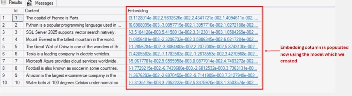 After inserting the textual data, we have to generate the embeddings for each content(row) using the external model which we have created. Use T-SQL's new function AI_GENERATE_EMBEDDINGS() to generate and insert the embeddings into document table.