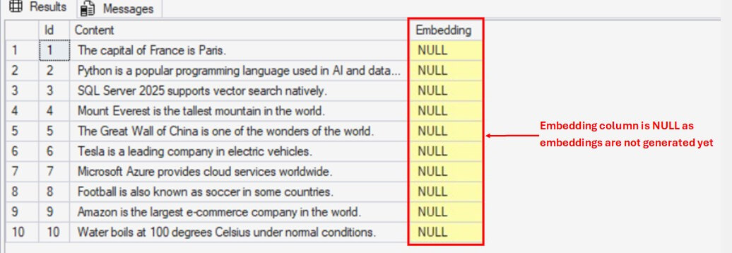CREATE TABLE dbo.Documents ( Id INT IDENTITY(1,1) PRIMARY KEY, Content NVARCHAR(MAX), Embedding VECTOR(1536) NULL -- for storing embeddings ); GO
