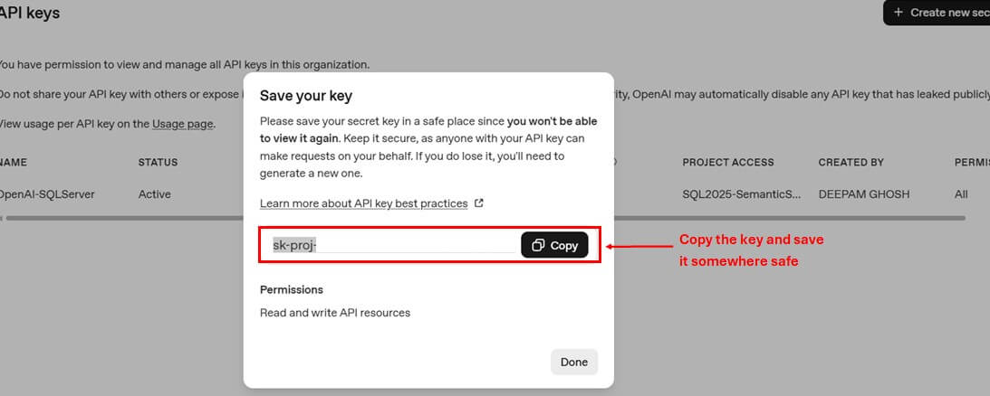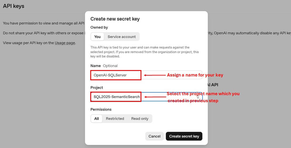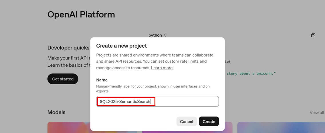 First, register on https://platform.openai.com/ and then create a new project.(e.g. SQL2025-SemanticSearch), as shown below.