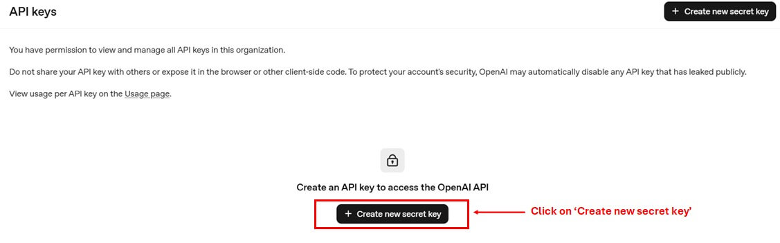 We will use Open AI's Web API in this demo. If you do not have an API key, you have to purchase one. To generate a new key follow the below steps: