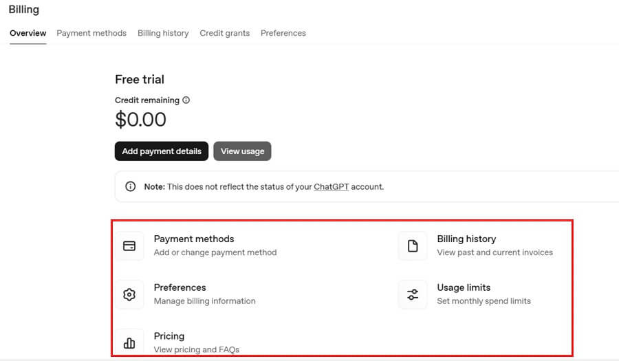 Next, you have to add a payment option from Billing section to buy the credits. Additionally you can track the pricings, billing history and usage limits from the same section.