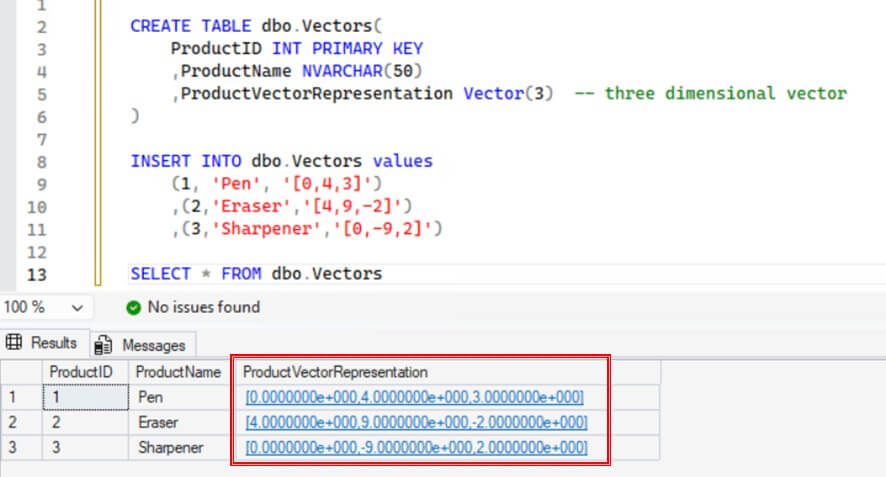 CREATE TABLE dbo.Vectors( ProductID INT PRIMARY KEY ,ProductName NVARCHAR(50) ,ProductVectorRepresentation VECTOR(3) -- three dimensional vector ) INSERT INTO dbo.Vectors values (1, 'Pen', '[0,4,3]') ,(2,'Eraser','[4,9,-2]') ,(3,'Sharpener','[0,-9,2]')