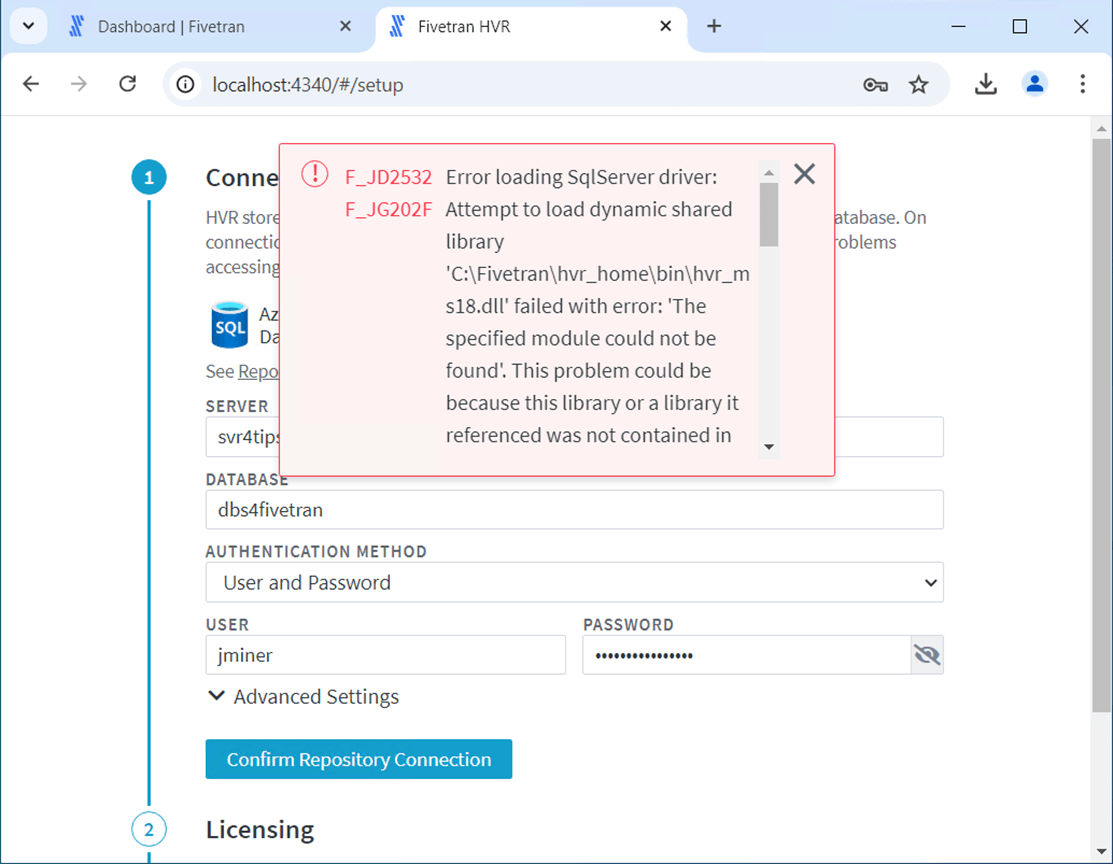 There are many different databases that can be used to contain the repository information. I chose to add a database named dbs4fivetran to an existing and logical Azure SQL Database Server. The installation errors out since we do not have the ODBC driver for SQL Server. Please download and install the driver now using this URL.