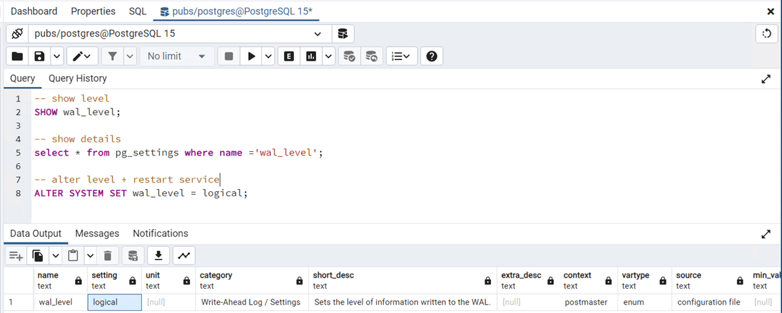 This article is not meant to be an administrator guide to PostgreSQL. However, the default write ahead logging for the database is not correctly set for Fivetran. By default, the database was set to replica. Use the ALTER SYSTEM command to change it to a value of logical. This will require a restart of the windows services. Also, any older logs will have to be truncated and/or rolled since Fivetran does not understand them.