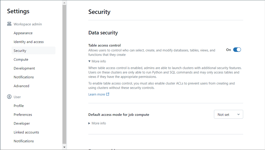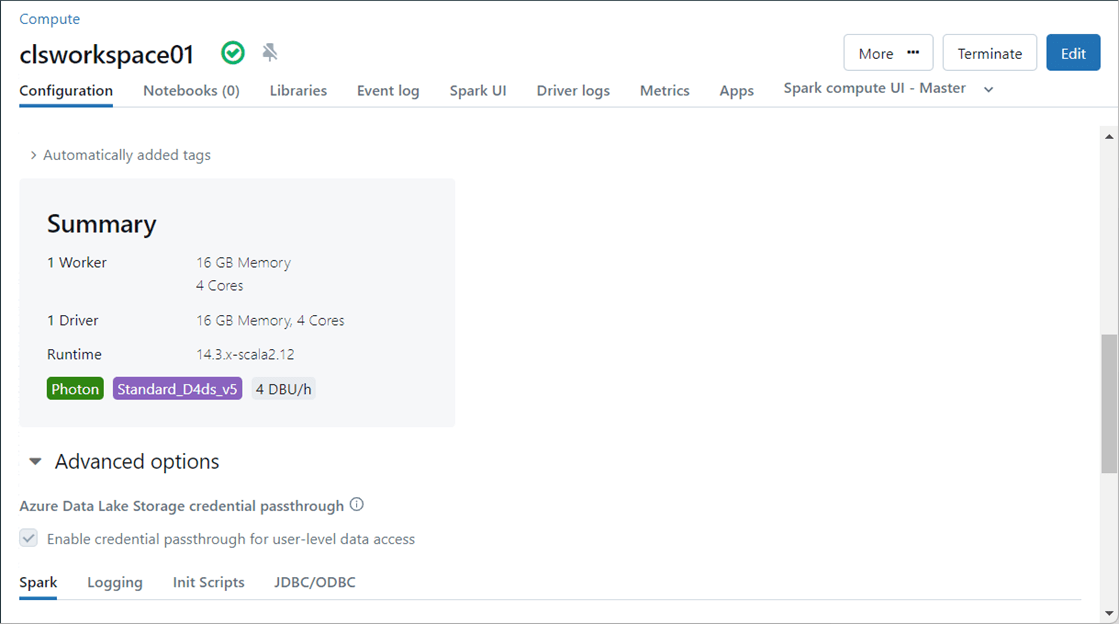 Since my Azure Databricks deployment has existed for some time, I do not have Unity Catalog. There are two things we need to configure for our cluster to work. First, we need to use credential passthrough to the Azure Data Lake Storage.