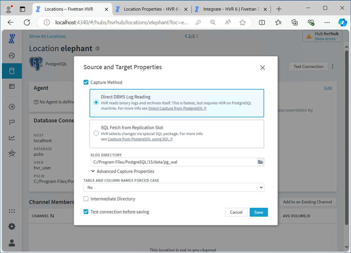 Let’s look at the elephant settings now. The typical database connection settings are seen below. I created a user named hvr_user with access to the pubs.