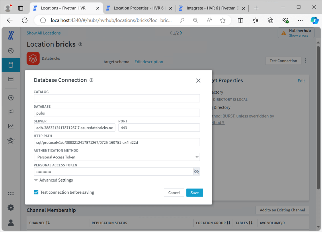 Let’s look at the brick settings now. Fivetran leverages the SQL endpoint of the Databricks cluster. This information can be found on the configuration of the cluster under advance options and JDBC driver. You will need to create an personal access token for the user profile in which Fivetran will use.