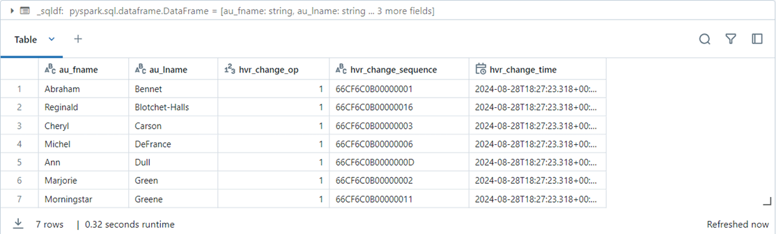 %sql select au_fname, au_lname, hvr_change_op, hvr_change_sequence, hvr_change_time from pubs.authors order by 2, 1 limit 7