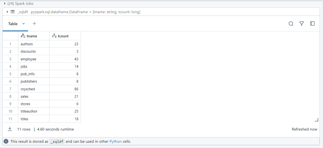 To see if the initial replication (snapshot) matches our PostgreSQL tables, run the following Spark SQL.