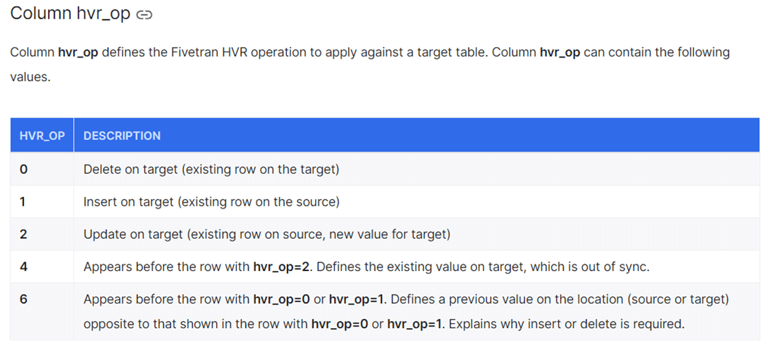 The image below was taken from the Fivetran documentation on HVR 6. It explains each change operation. If we sort by sequence number, we can see the last operation was a delete.