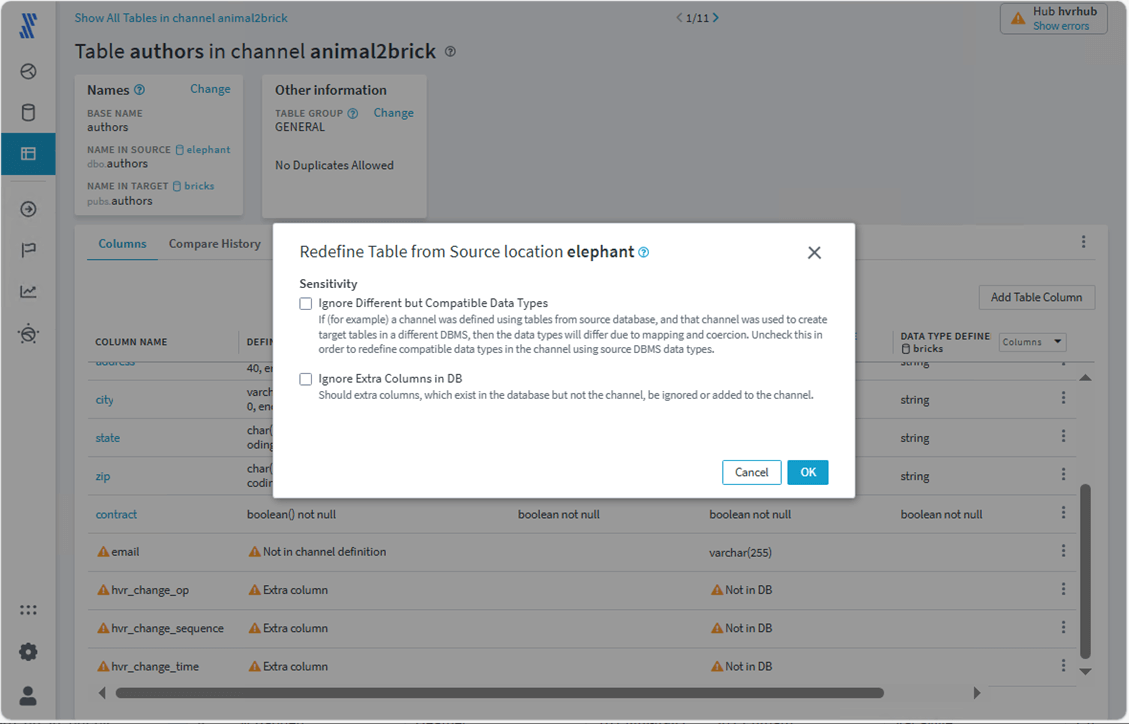 Even with AdaptDLL, a change to a primary key definition will cause a full refresh of the table. If we find the authors table in the Hub software, we can click the three ellipses to redefine the table from the source. See image below for details. You optionally can select sensitivity if you want to ignore changes.