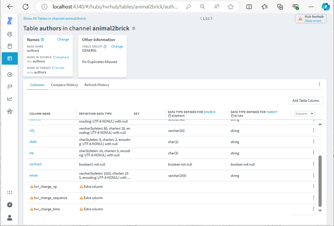 Manually drop the authors table from the Hive database. Run the refresh to create missing target tables.