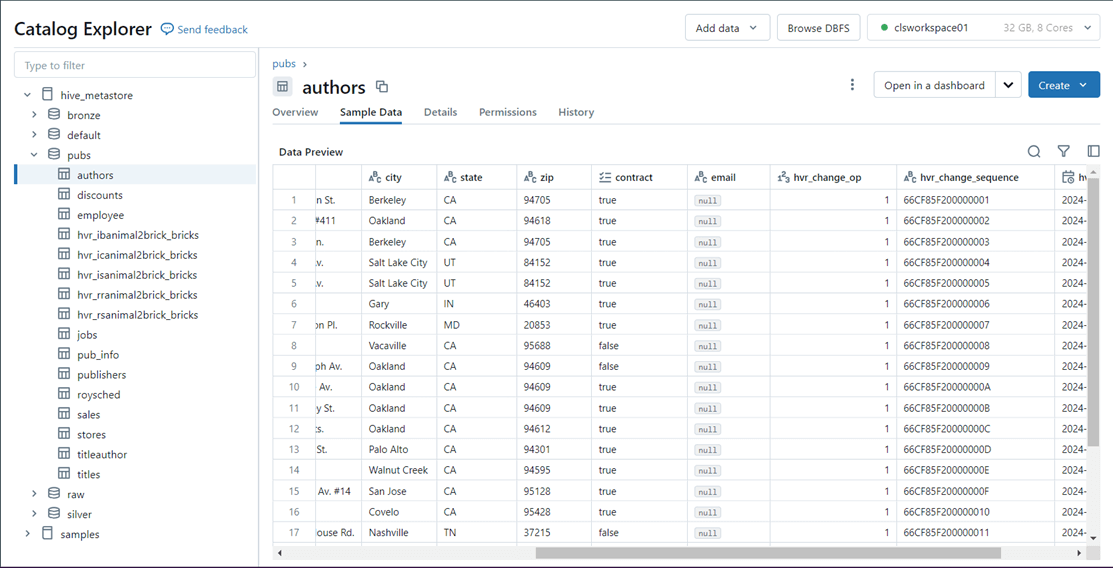 If we look at the hive database and authors table in the Catalog Explorer of Databricks, we can see the new column named email has appeared. Please note there are six tables prefixed with hvr. These are used by Fivetran and should not be touched. Additionally, a table with a postfix of _b might appear for the base tables of our model. This table appears when bursting happens.
