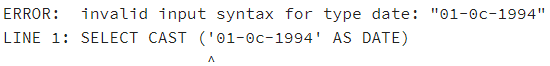 However, again if we try to CAST any string that is not in any of the standard date formats (for example, 01-0c-1994), the function will return an appropriate error as follows: