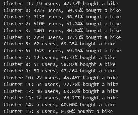 print(f"Cluster {cluster_id}: {len(group)} users, {buyer_pct:.2f}0ought a bike")Running the DBScan code