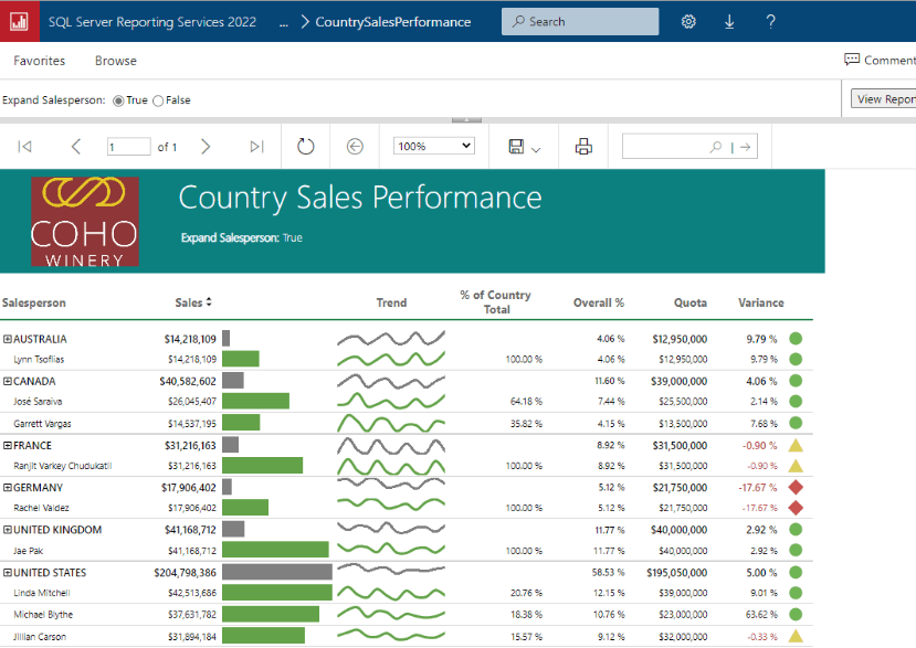 Here is a report running on my local SSRS server. You can see this is a common SSRS type of report that I've built using some of the Microsoft samples.