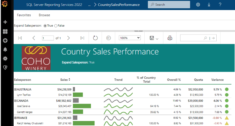 Here the same report appears once I've restarted, SSRS. Notice the Grafana sidebar.