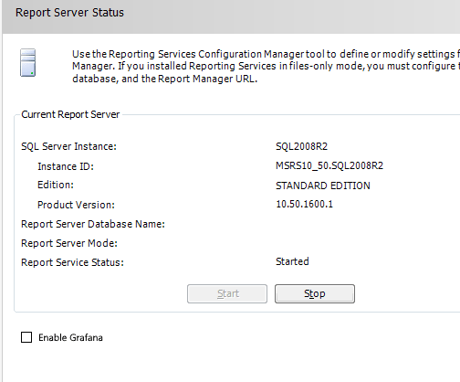 The next thing you need to do is start your Reporting Services Configuration Manager. Once you do that, on the main tab you will see your service status. At the bottom, you'll see a new checkbox that says "Enable Grafana". Click that and then stop/start your Reporting Services config.