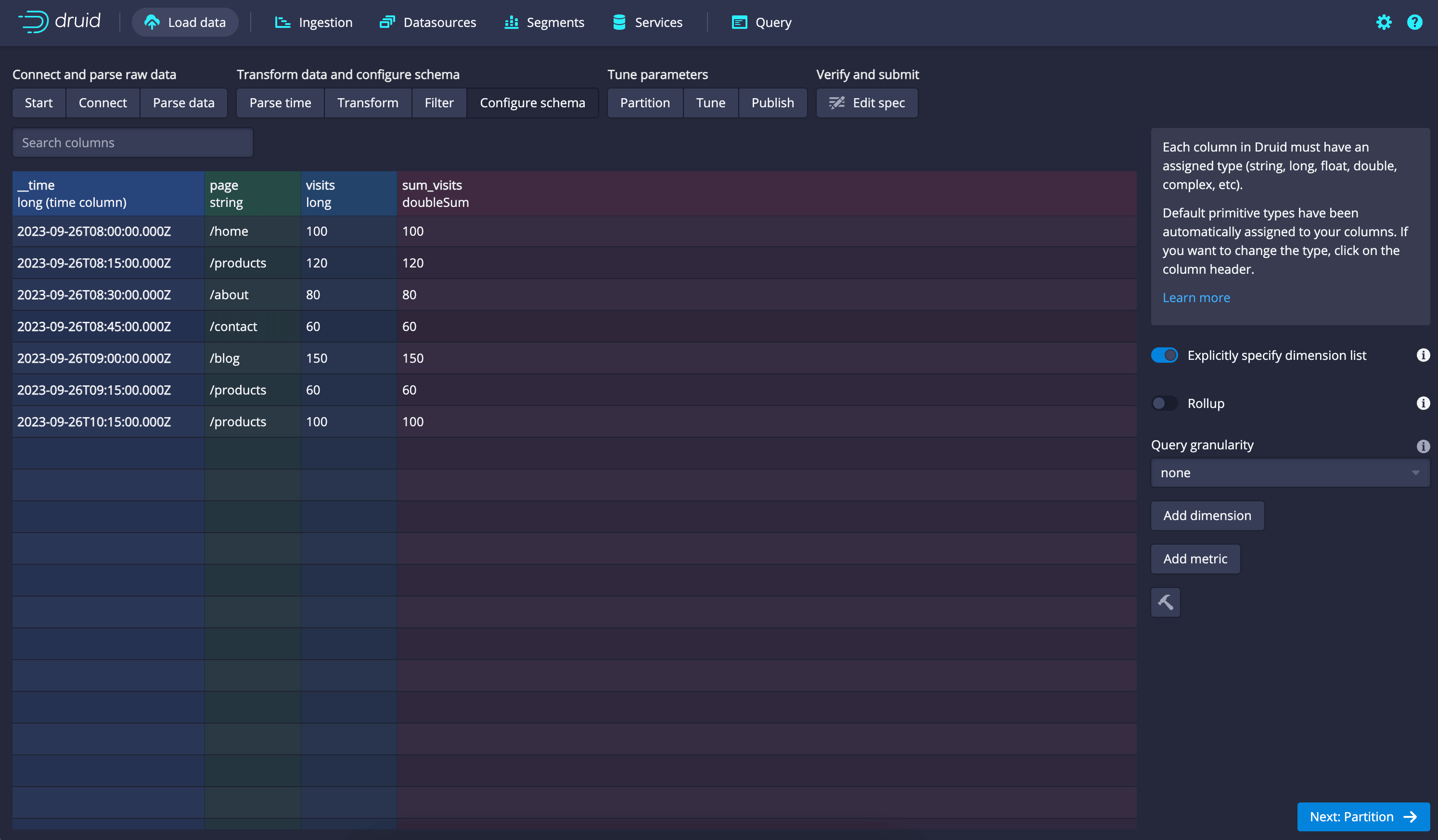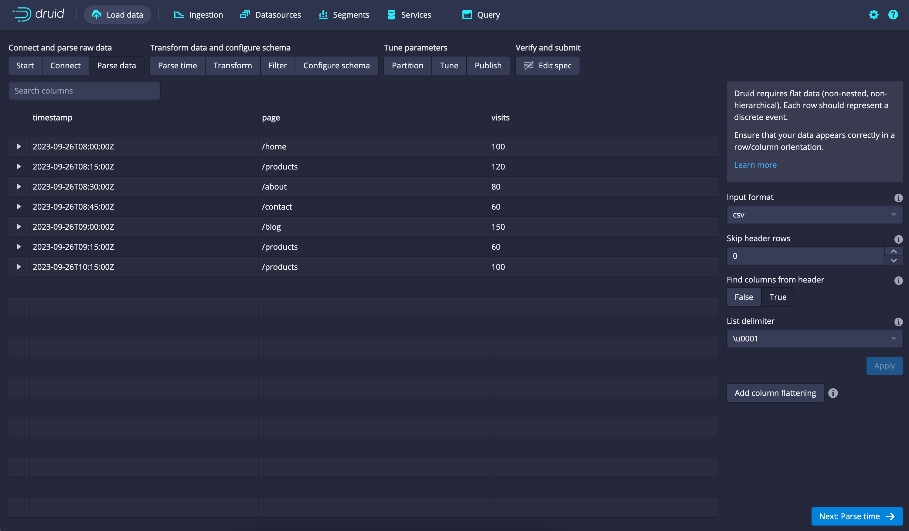 - In the "Define your schema" section, Druid will automatically detect your CSV header and suggest a schema. Make sure the schema matches your data correctly. You can make adjustments if needed.