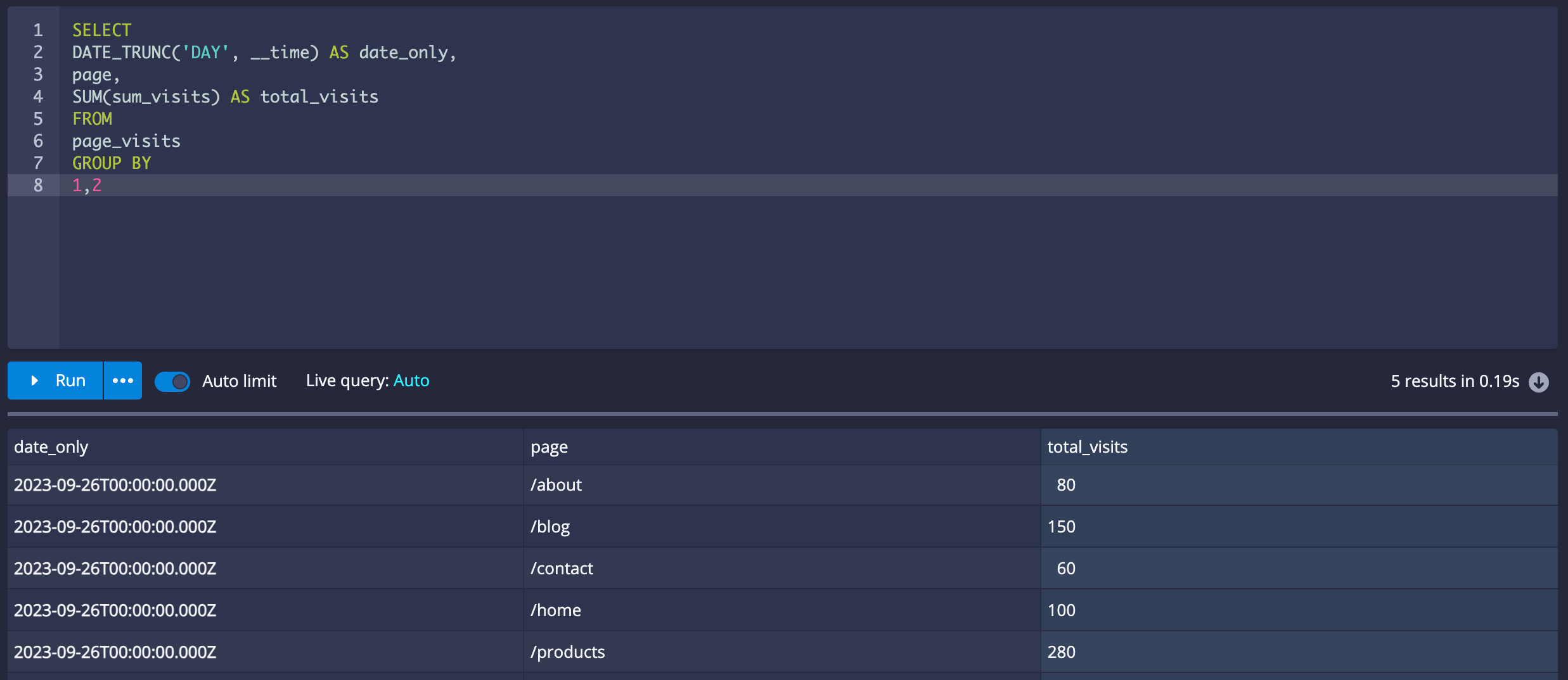 1,2This query calculates the total visits per page per day from the ingested data.