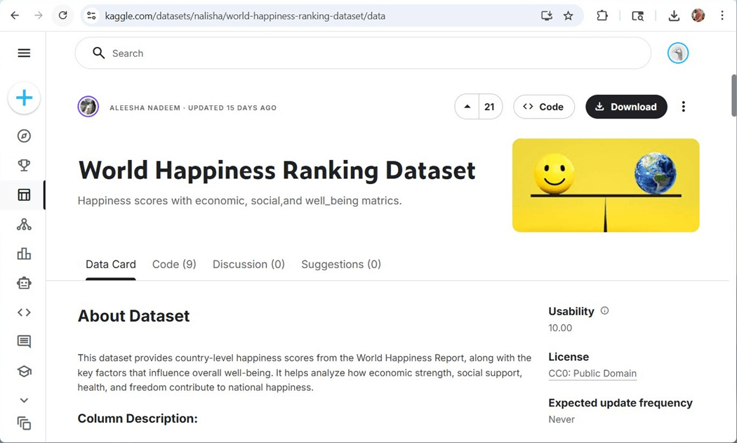 One place that is usually go to for sample datasets is Kaggle. It is known for Machine Learning contests and articles. The image below shows the world happiness ranking dataset.