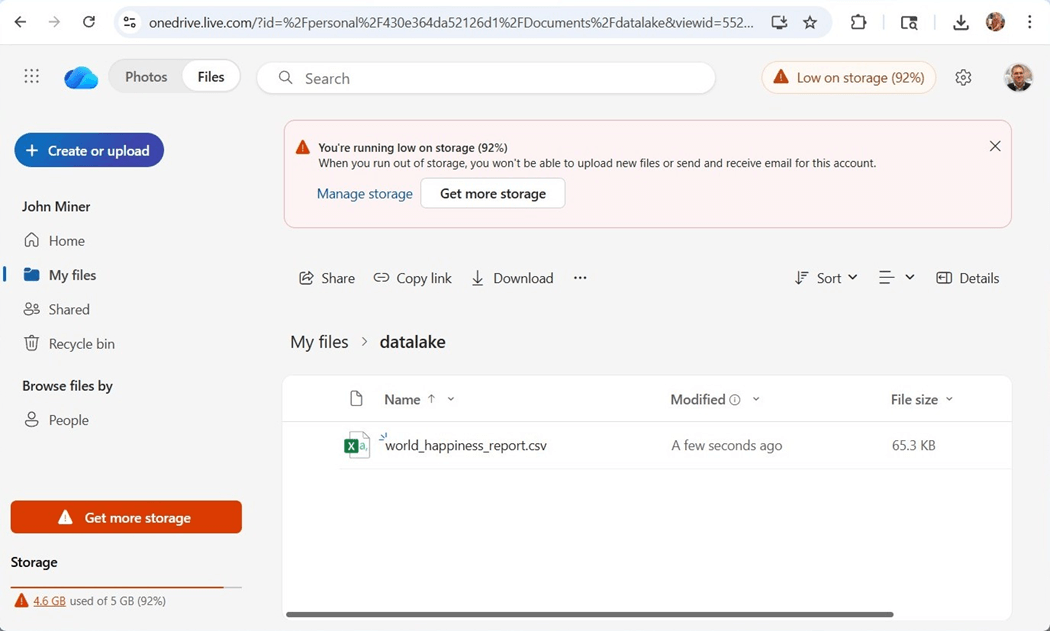 I am going to repeat the process of making a folder named “datalake” and uploading the “world_happiness_report.csv” file to the folder.