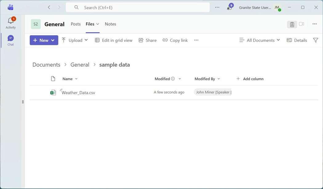 The OneDrive root folder will show up under files. The next step is to write some code to read in the CSV file and transform the dataset.