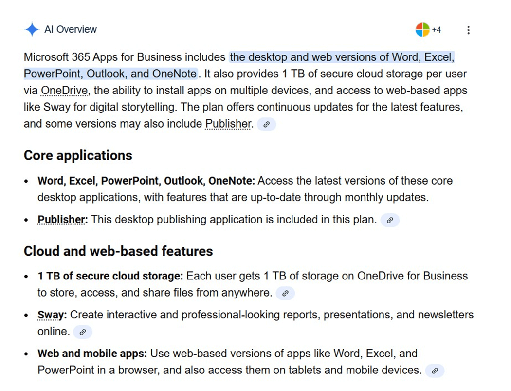 In the era of Artificial Intelligence, I asked what was included within an Office 365 Applications license. The response is shown below. The key item is 1 TB of storage via the OneDrive service.