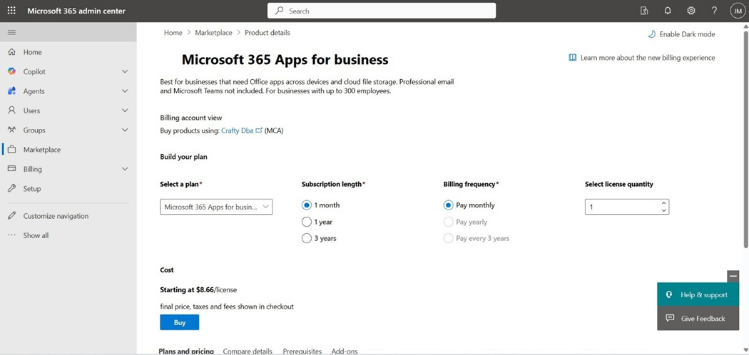 I happened to be both an Office 365 administration and a Billing contributor. That helps since we order the license via the Microsoft 365 administration center, but the charges are posted on the Azure subscription. The image below shows my request for purchasing one end user license for one month.