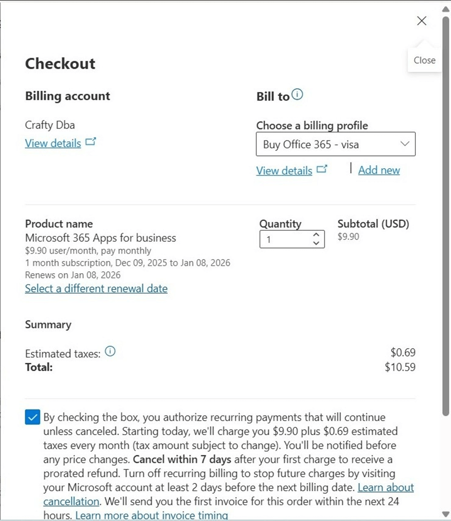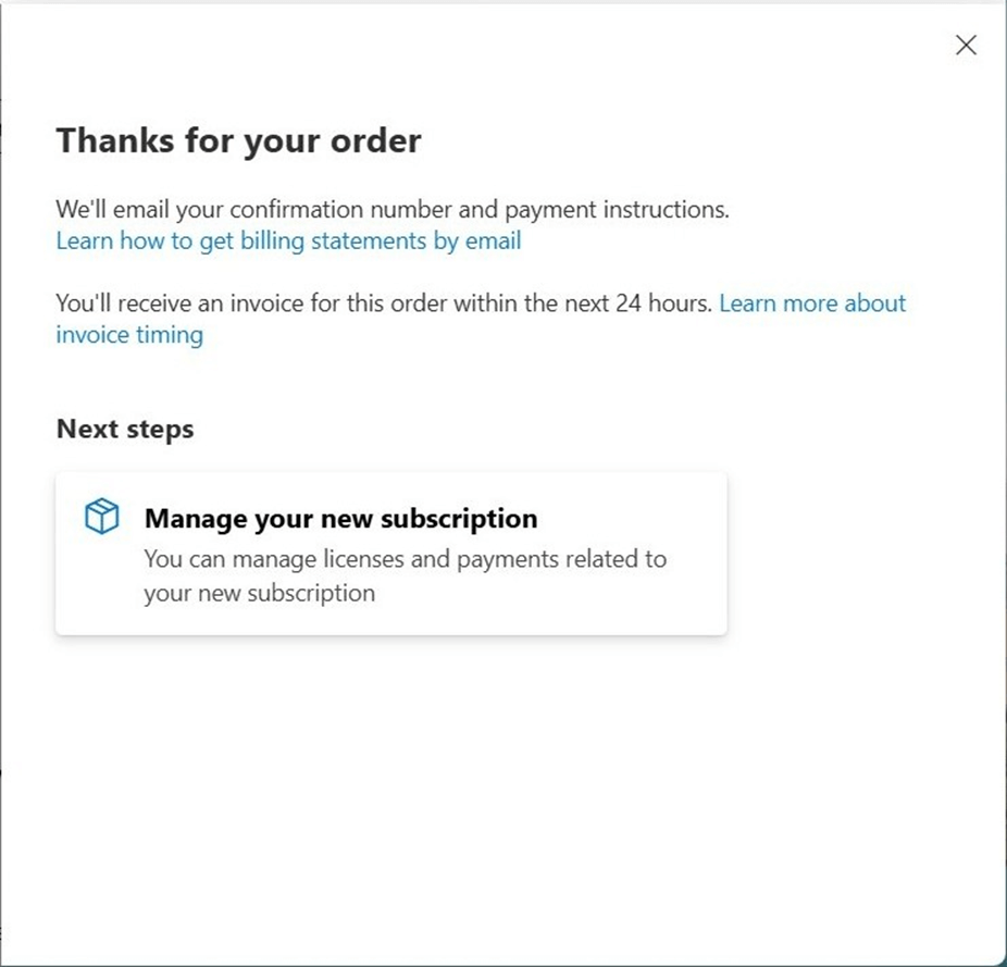 Microsoft kindly thanks us for the new software monthly subscription. Remember, this automatically renews unless you return the license.