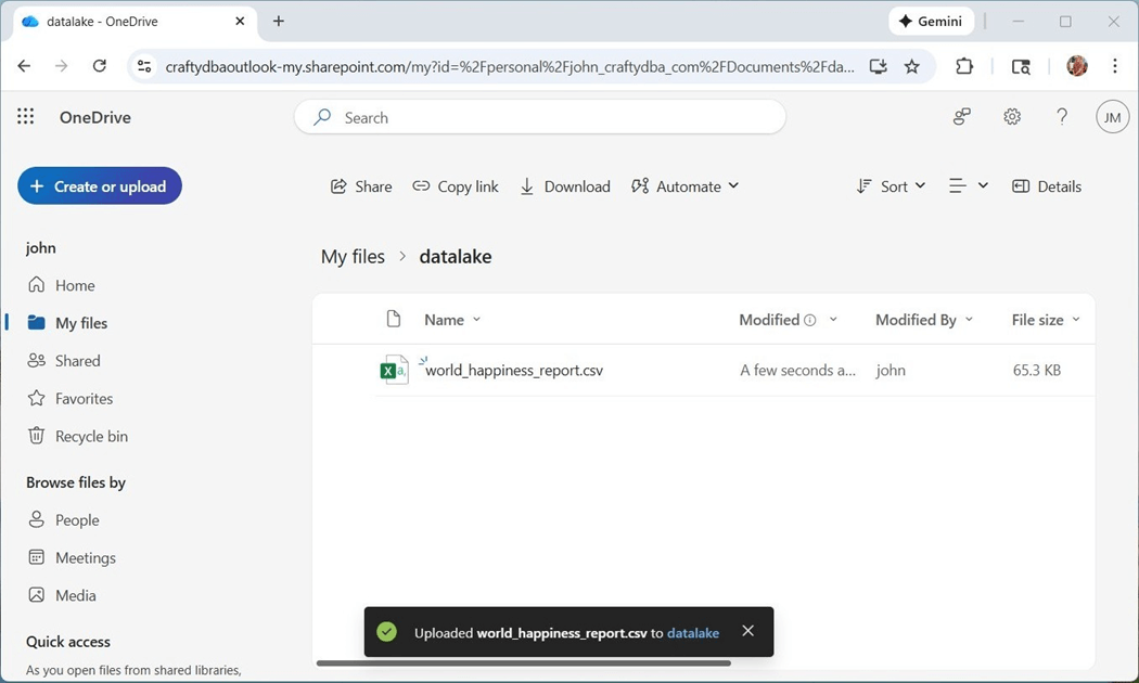I created a folder, called datalake, and uploaded the csv file into that folder.