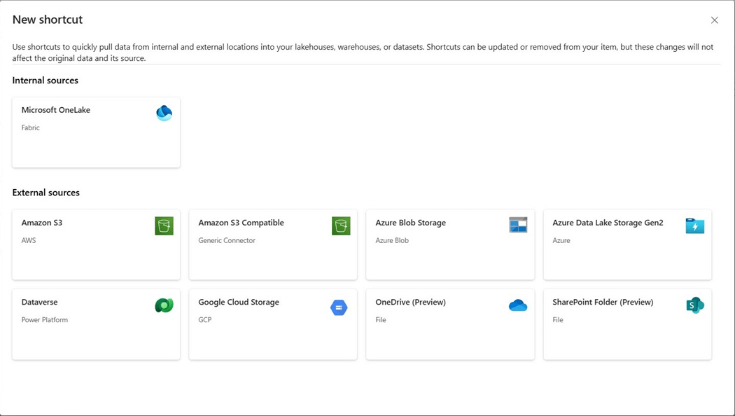 Both the OneDrive and SharePoint shortcuts are in preview. Open the Fabric Lakehouse and right click on the Files folder. The option to create a new shortcut must be selected. The next screen asks the end user which type of shortcut to create.
