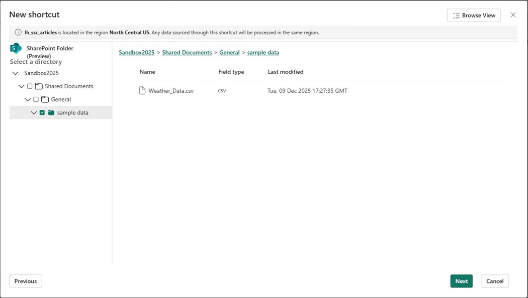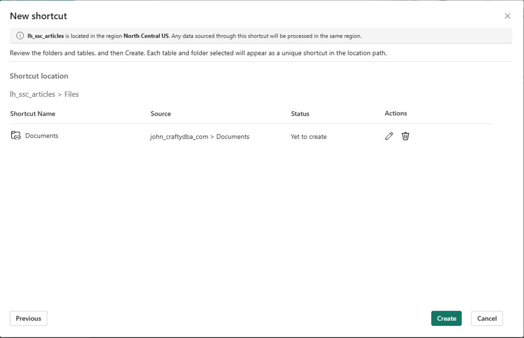Please verify and click the create button on the next dialog. Now that we have a shortcut to the SharePoint folder, let us write some code to ingest the weather file.