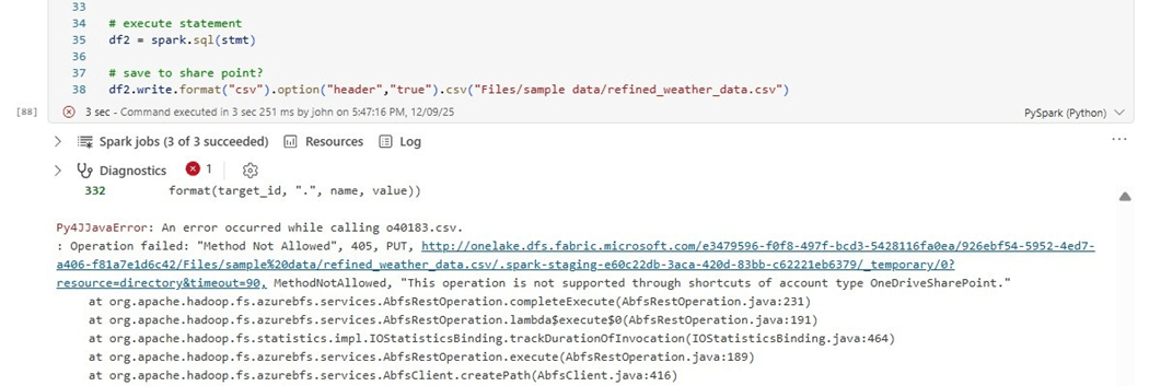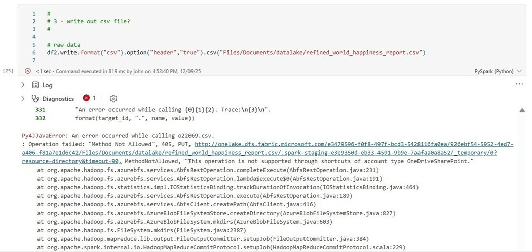 It is difficult to keep track of which shortcut types are read only and the ones that allow writes. Microsoft has changed its mind over time. The easiest way to find out the properties of the shortcut is to create code. The notebook cell below has Python code that tries to write the processed dataset back to OneDrive as a new file. It fails.