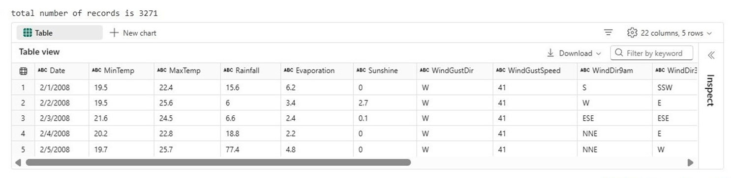 The Python cell below reads the file from the OneDrive service. It displays a row count of the dataset and shows a snapshot of the first five records.