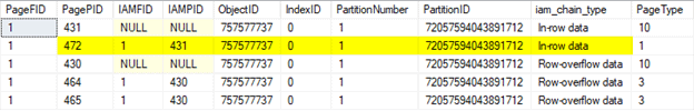 Excluding the two IAM pages, SQL Server allocated one in-row (page 472), two row-overflow pages (464 and 465). Examining the in-row page 472 reveals that SQL Server stored the ID column and LOB column lobcol values on it. The two variable-length columns, varcol1 and varcol2, are stored on the row-overflow pages 464 and 465, respectively. Therefore, even though we had a LOB data type for lobcol column, SQL Server still stored it on an in-row page since the data size could accommodate it.