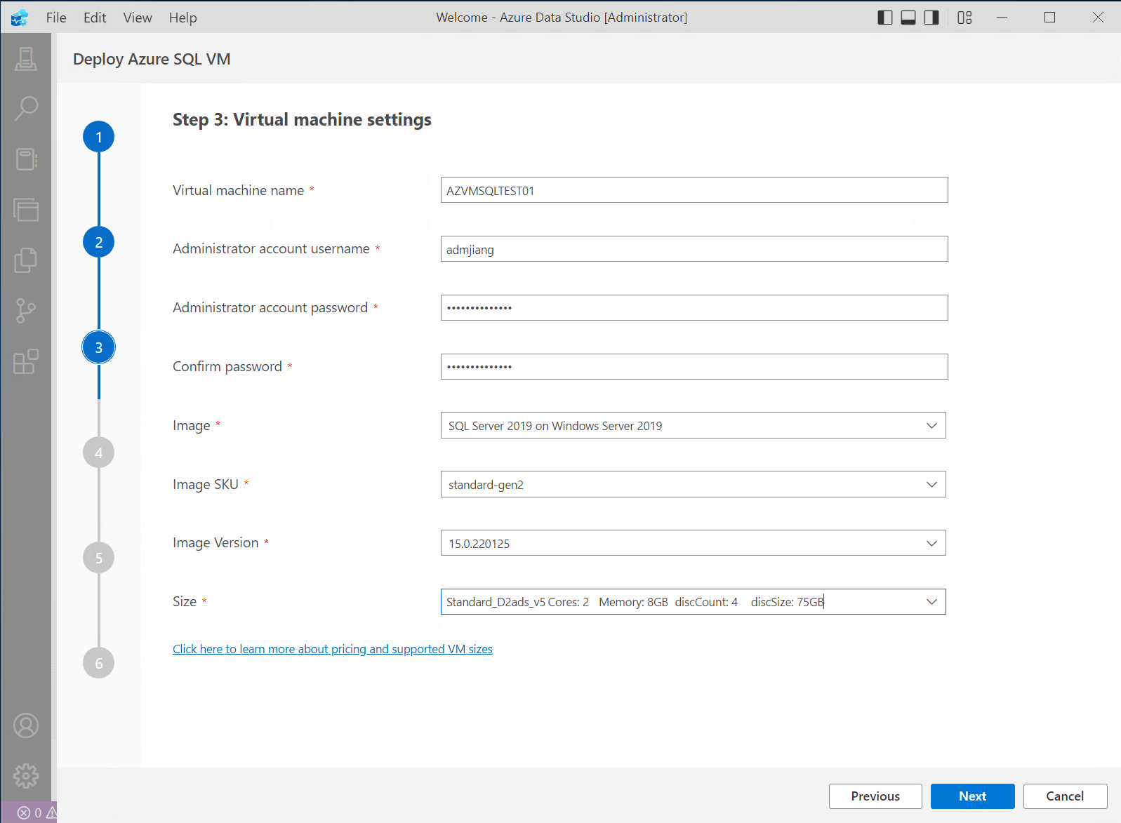 Step 6: Configure "Virtual machine settings", here you can configure the Windows server version and SQL Server version and edition: