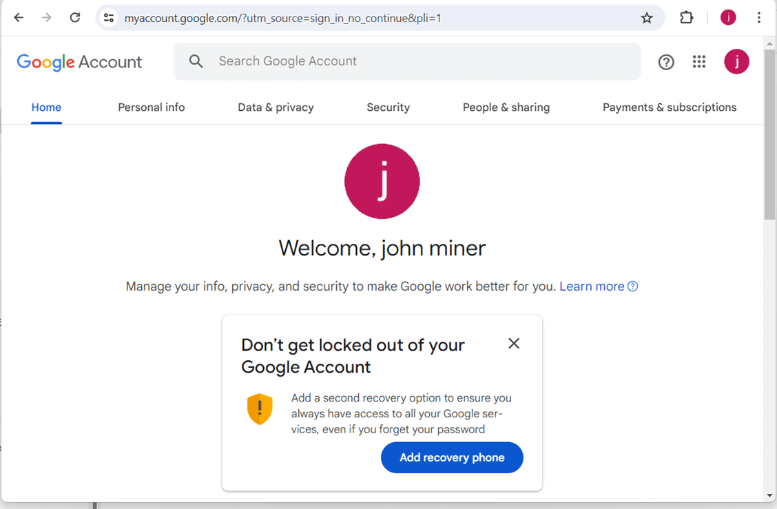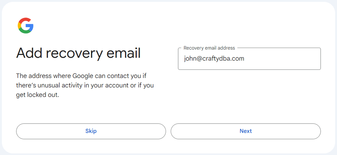 Most cloud systems want a recovery email. That way if the google account gets locked, a password reset email can be sent to my john@craftydba.com mailbox.