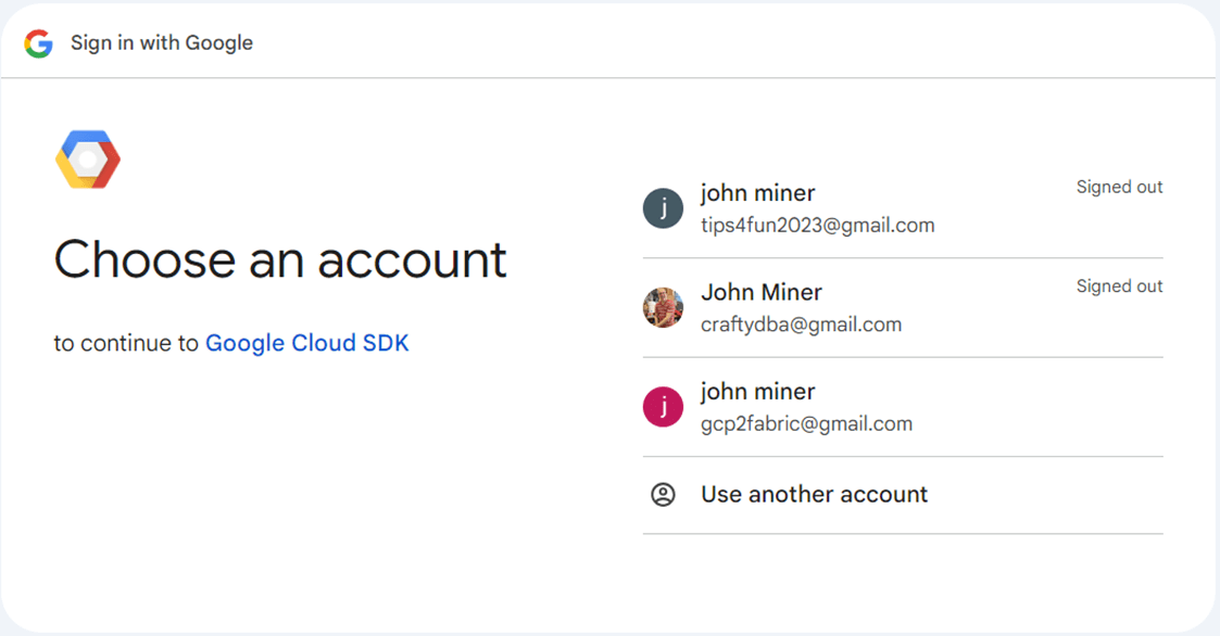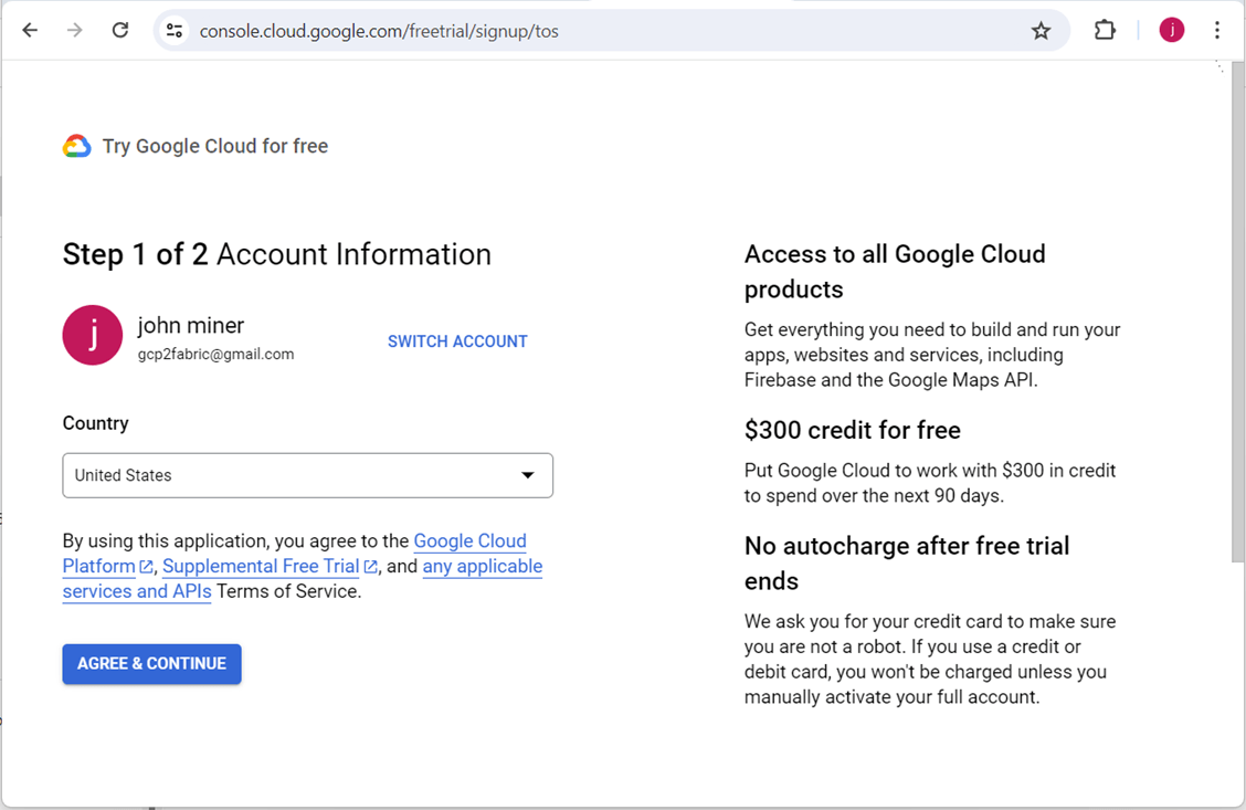 Google will suggest some account names that are not currently in use. The name I gave my user account is gcp2fabric. This describes how we want the data to flow from GCP to Fabric.