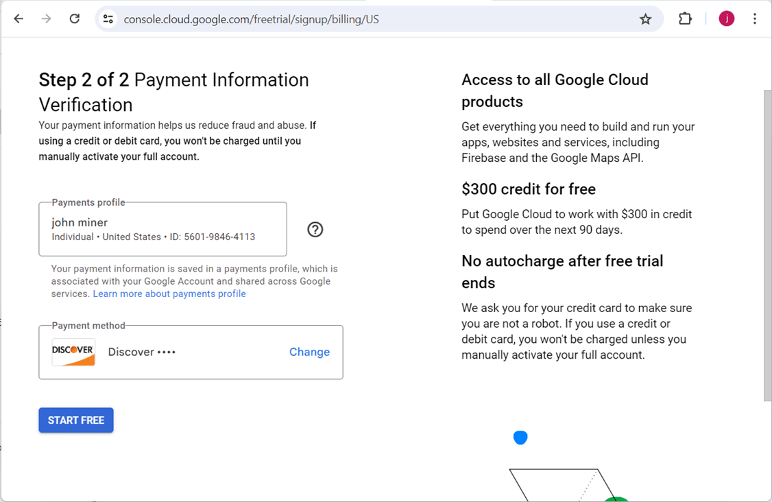 The payment verification screen is a two-part process. First, you must enter billing information. Second, you will need a credit card to back the account. The card is never charged. But watch out for those pesky popups that ask you to convert to a real account. That is when the billing starts!