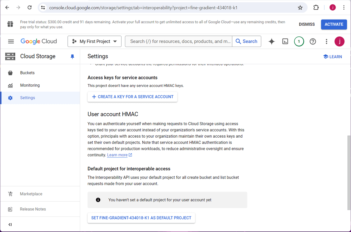 Most cloud vendors have the idea of a service account. Usually, this account does not have access to the cloud console. It is intended for use with programs to automate a task. Go to the settings section of the GCP bucket. Choose the create a key for a service account button.