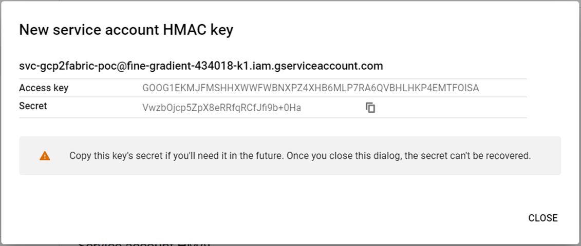 The name of the service account is not important since we just need the access key and access secret. I chose to name the service account as svc-gcp2fabric-poc.