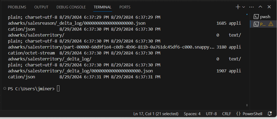 The very last test is to upload the advwrks folder to the cloud. This folder contains 11 delta tables. The image shows the working directory for our GCP bucket test.