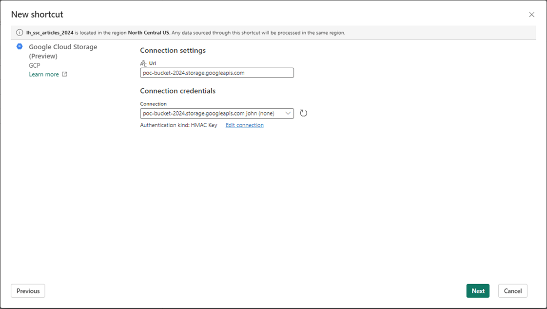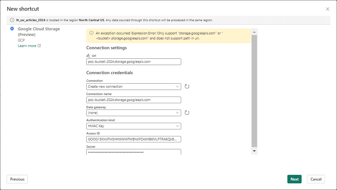 The creation of the GCP resources was the hardest part of this article. When creating shortcuts to a GCP bucket, you need to create a service account with access to the bucket. Create an Access Key and Secret commonly known as an HMAC key. Microsoft PowerShell can be used to validate uploading and downloading files and folders.