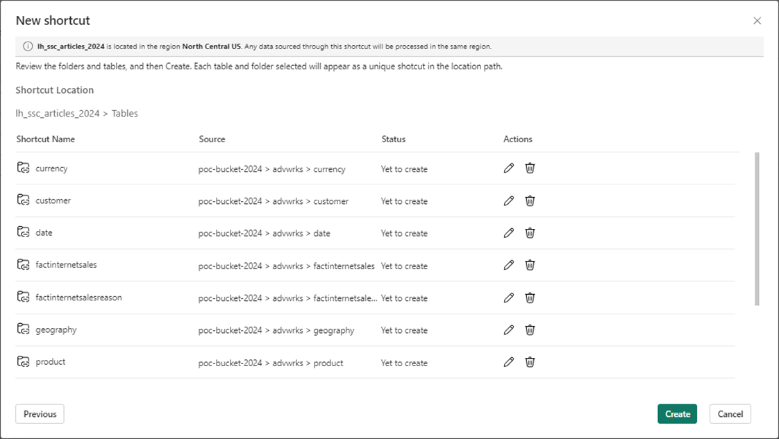 Now, we want to create shortcuts for the eleven Delta Tables. The GUI is smart enough to know we created a connection already for this storage URL.